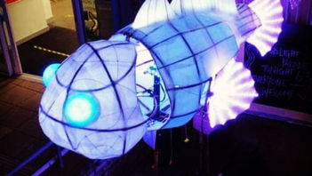 He is illuminated with over 3000 LEDs and built on a tricycle base and comes with 2 puppeteers who will, animate and steward the appearance at your event. His onboard PA plays a beautiful soundscape of bubbling water, the sea sounds and the Goby fish singing his way along. A lovely ethereal and calm sound to grace your light night event.